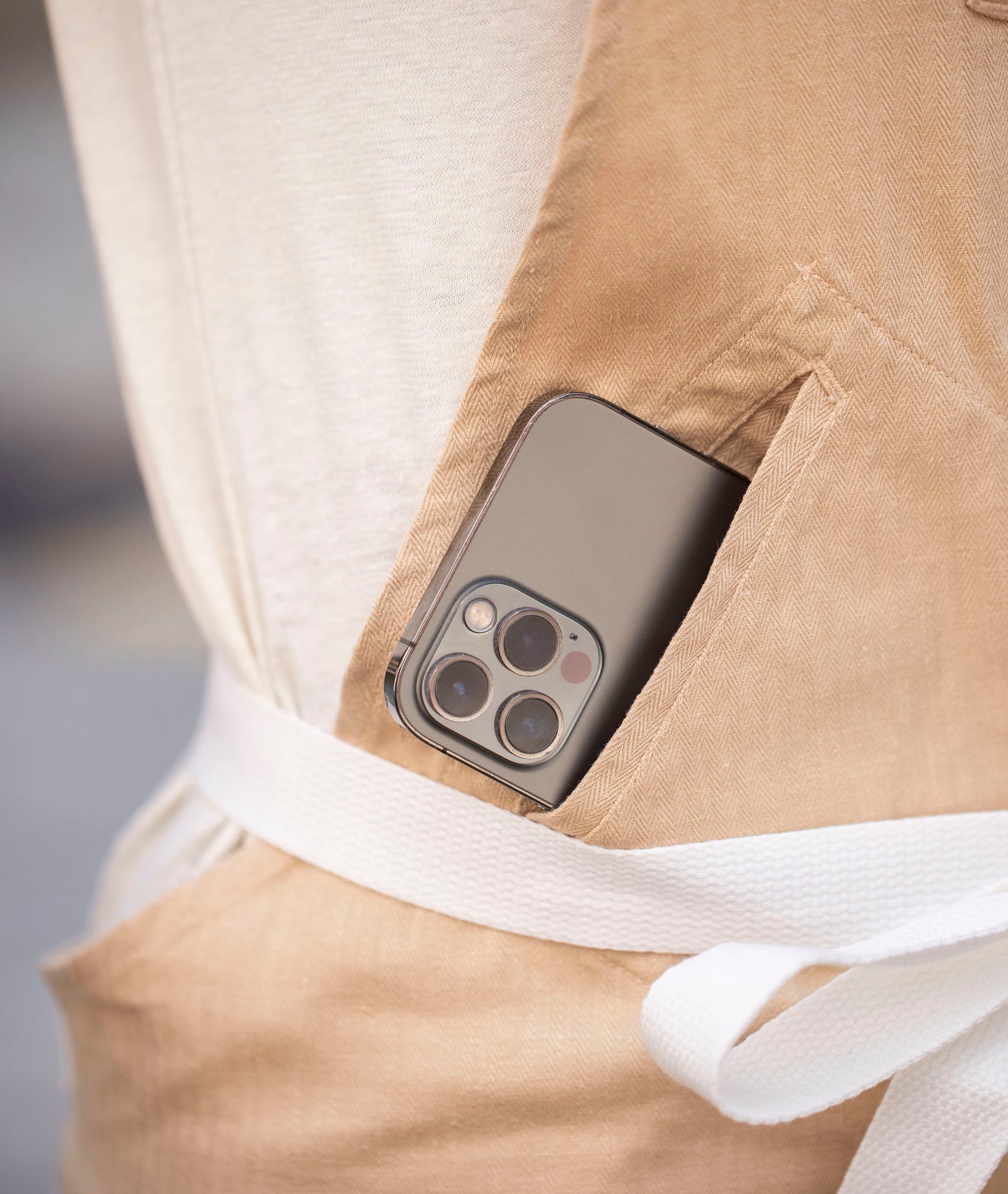 Bold yet subtle, the Everyday Hemp Apron is light, breathable and naturally odour resistant. The apron features a convenient double pen / thermometer chest pocket and a functional phone pocket on the side.